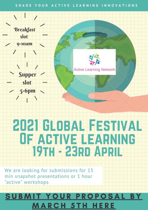 So, Glastonbury is cancelled for another year…. But do not fear. The Active Learning Network is on the case. From 19th- 23rd April, we will be hosting the Global Festival of Active Learning online! For two hours each day, during that week, there will be a chance to share, listen, collaborate and network with fellow active learning practitioners. Do you fancy a turn on the virtual “main stage” running a workshop or delivering a short presentation? Or perhaps you want to run an event in one of our virtual tents around a specific active learning theme? Maybe its an active learning chat around a “campfire” that sounds appealing or a chance to enter the “moshpit of active learning” where you can push around some ideas, problems or discussion ideas and get some feedback? If you would like to submit a proposal, please do. We welcome creative ideas of all kinds.